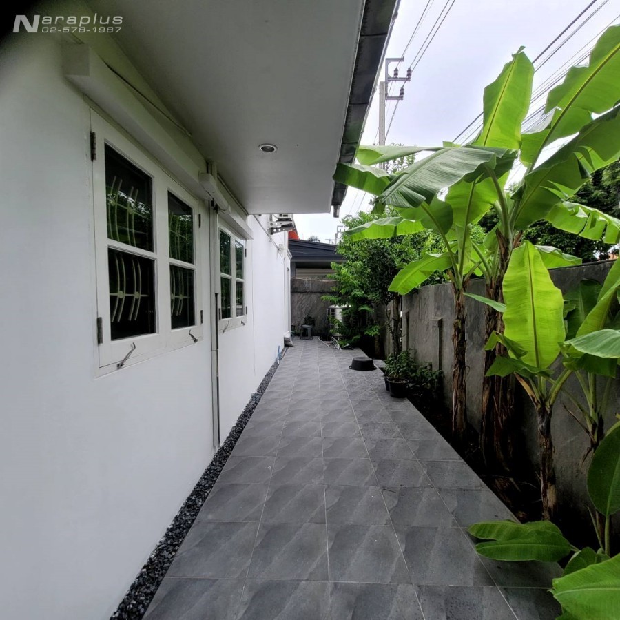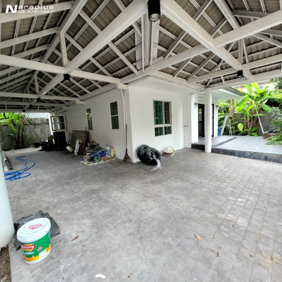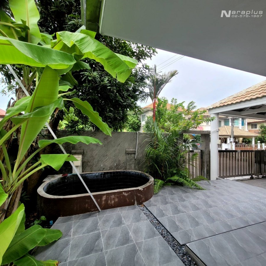 บริเวณบ้าน : มีพื้นที่ด้านข้างรอบตัวบ้าน ปูกระเบื้องกันลื่น สำหรับกิจกรรมในวันหยุด พักผ่อน และมีมุมสำหรับนั่งดื่มกาแฟยามเช้า เปลี่ยนประตูใหม่เป็นอลูมิเนียมอย่างดีทั้งหน้าบ้านและข้างบ้าน ต่อเติมโรงจอดรถในบ้านสามารถจอดรถได้ 3 คัน